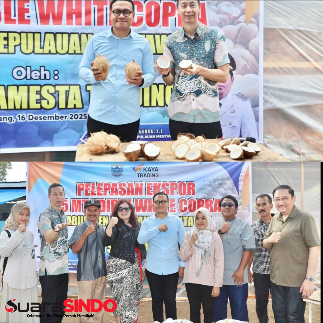 SuaraSINDO.com, KEPULAUAN MENTAWAI – Bupati Kabupaten Kepulauan Mentawai, Rinto Wardana, secara resmi melepas ekspor perdana 25 metrik ton edible white copra yang diproduksi oleh PT Kaya Samesta Trading, Selasa (16/11). Ekspor perdana ini ditujukan ke India dan Pakistan, sekaligus menjadi tonggak penting dalam mendorong hilirisasi komoditas kelapa serta meningkatkan pendapatan masyarakat Kepulauan Mentawai.