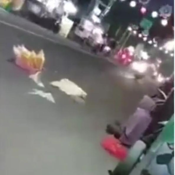 Dalam video berdurasi 1 menit itu, tampak seorang perempuan berjilbab duduk di aspal. Sedangkan satu keranjang kerupuk dagangannya berada di tengah jalan. Alas tempat berjualan dan sandal miliknya juga berserakan di jalan tersebut.
